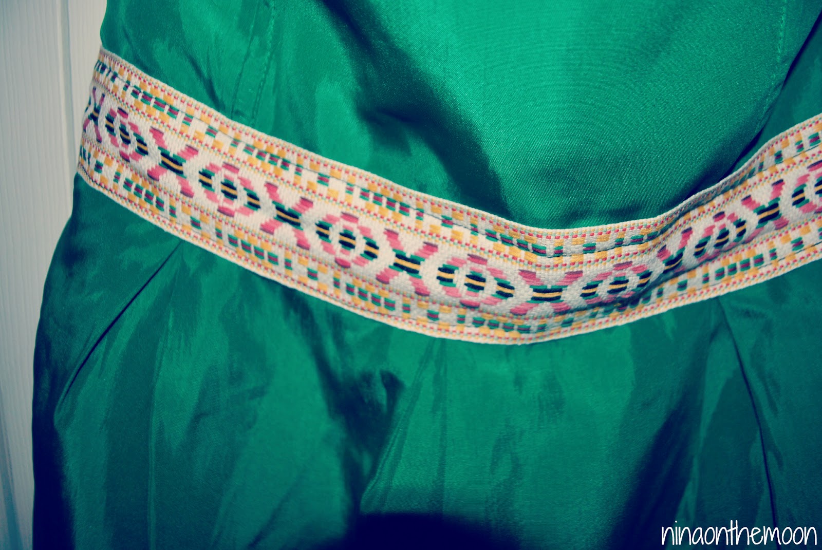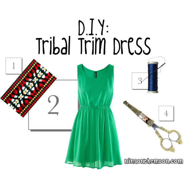This do it yourself project is perfect for one of this years hottest trend, which is tribal print! I have had this dress for many years, and it is one of my favorite’s, since it’s one of those chameleon pieces that changes so drastically with accessories (belts, jewelry, shoes, purse). Anyways, I decided I wanted to give it a permanent change…with a tribal print! 🙂 You can find tribal trim in just about any fabric store, it all depends on your preference.Step 1: Pick your dressStep 2: Pick your tribal trimStep 3: Measure your trim around that part you want to sew it onto, and secure with pins. I chose the middle, but you could do top, middle, bottom, sides..anything really 🙂Step 4: You can sew, or stitch if you don’t have a sewing machine…PS- I have absolutely no sewing skill, I just grab the machine and hope I don’t sew my fingers :/ Hahaha, seriously.