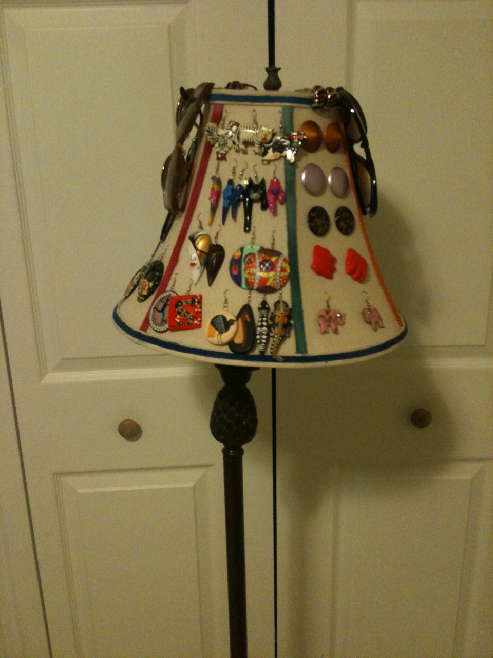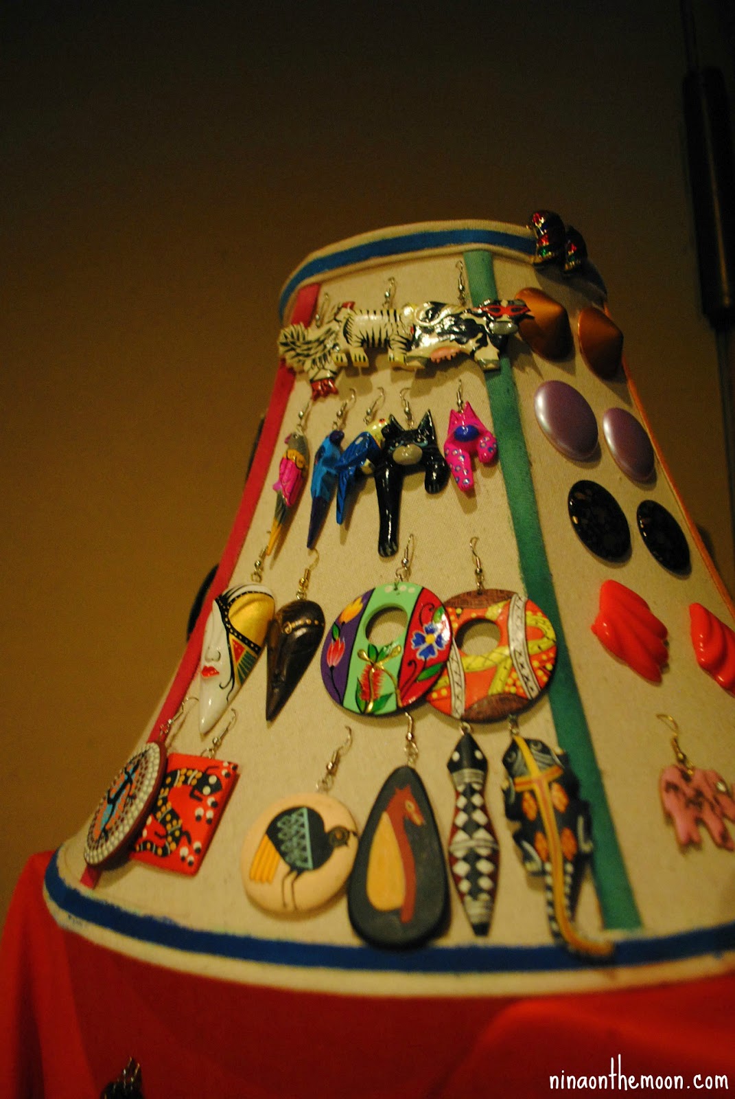 I’ve been thinking about recycling it for a couple days, but didn’t know how…until one day I saw the huge bag of earrings that I had made!! Tah-dah, my EUREKA moment, I decided to make it into an earring display/holder. No, unfortunately, the one pictured above is not the one I made; that’s actually a functioning lamp and I just added the earrings onto it, via photshop, but I bet I can try to make one like that for next time! Hehehe. The one I made is pictured below 🙂