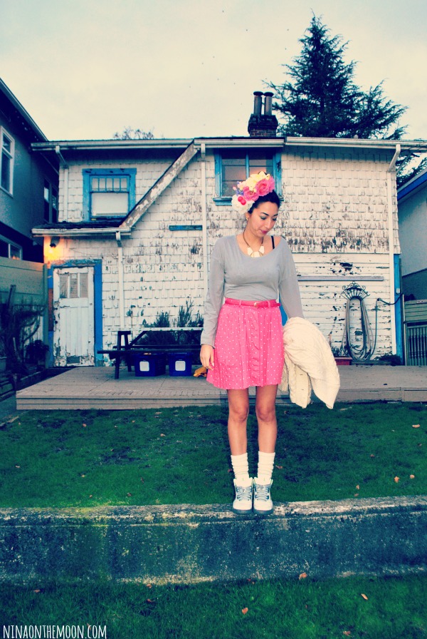 wearing:DIY floral headpiece – long sleeve c/o JVL Los Angeles – Gap belt – Tabi Skirt – Air Jordan Retro V – Chunky sweater